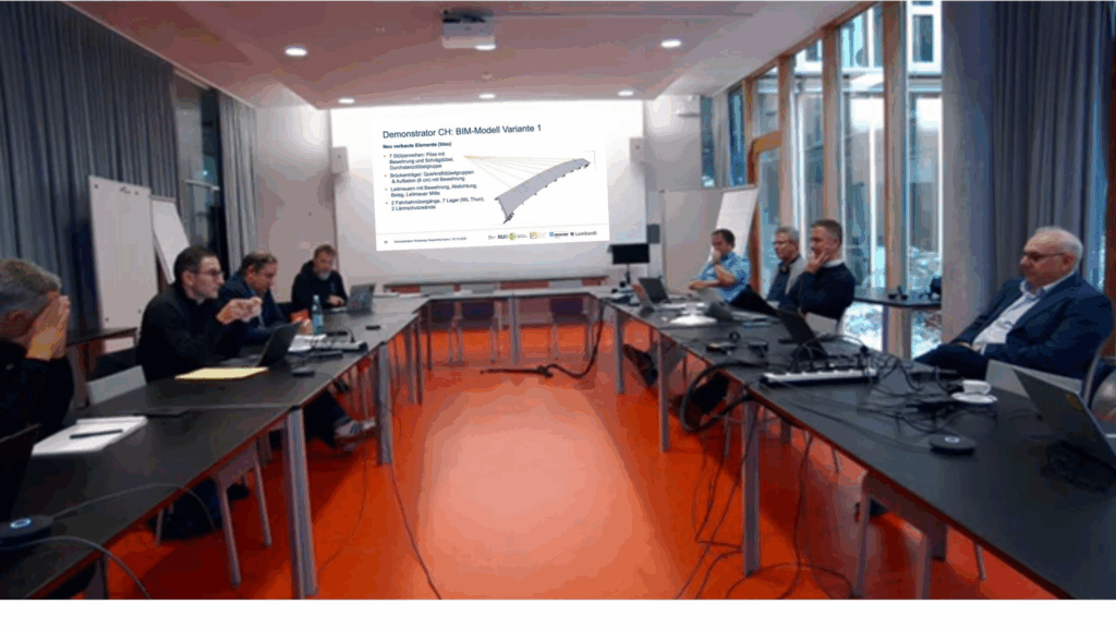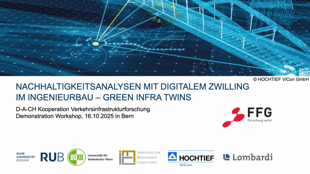 Im Oktober fanden drei Workshops im Forschungsprojekt ๐—š๐—ฟ๐—ฒ๐—ฒ๐—ป๐—œ๐—ป๐—ณ๐—ฟ๐—ฎ๐—ง๐˜„๐—ถ๐—ป๐˜€ statt, um zwei zentrale Zukunftsthemen mit Projektergebnissen zu diskutieren: ๐——๐—ถ๐—ด๐—ถ๐˜๐—ฎ๐—น๐—ฒ ๐—ญ๐˜„๐—ถ๐—น๐—น๐—ถ๐—ป๐—ด๐—ฒ und ๐—ก๐—ฎ๐—ฐ๐—ต๐—ต๐—ฎ๐—น๐˜๐—ถ๐—ด๐—ธ๐—ฒ๐—ถ๐˜๐˜€๐—ฏ๐—ฒ๐˜„๐—ฒ๐—ฟ๐˜๐˜‚๐—ป๐—ด๐—ฒ๐—ป ๐˜ƒ๐—ผ๐—ป ๐—œ๐—ป๐—ด๐—ฒ๐—ป๐—ถ๐—ฒ๐˜‚๐—ฟ๐—ฏ๐—ฎ๐˜‚๐˜„๐—ฒ๐—ฟ๐—ธ๐—ฒ๐—ป. In Bern, Wien und Essen wurden die Ergebnisse des Projektes unter anderem dem Betreuerkreis und interessierten Stakeholdern vorgestellt, jeweils mit einen Fokus auf den Demonstratorprojekten aus Schweiz, ร–sterreich und Deutschland. Beispielsweise wurde der Schweizer Demonstrator (รœberfรผhrungsbauwerk am Berner Ostring) prรคsentiert, bei dem zwei Erhaltungsvarianten des Ingenieurbauwerks bezogen auf Nachhaltigkeitsindikatoren miteinander verglichen wurden. Dieser Anwendungsfall zeigt eindrucksvoll, wie digitale Zwillinge zur Bewertung und Optimierung der Nachhaltigkeit รผber den gesamten Lebenszyklus von Bauwerken eingesetzt werden kรถnnen.